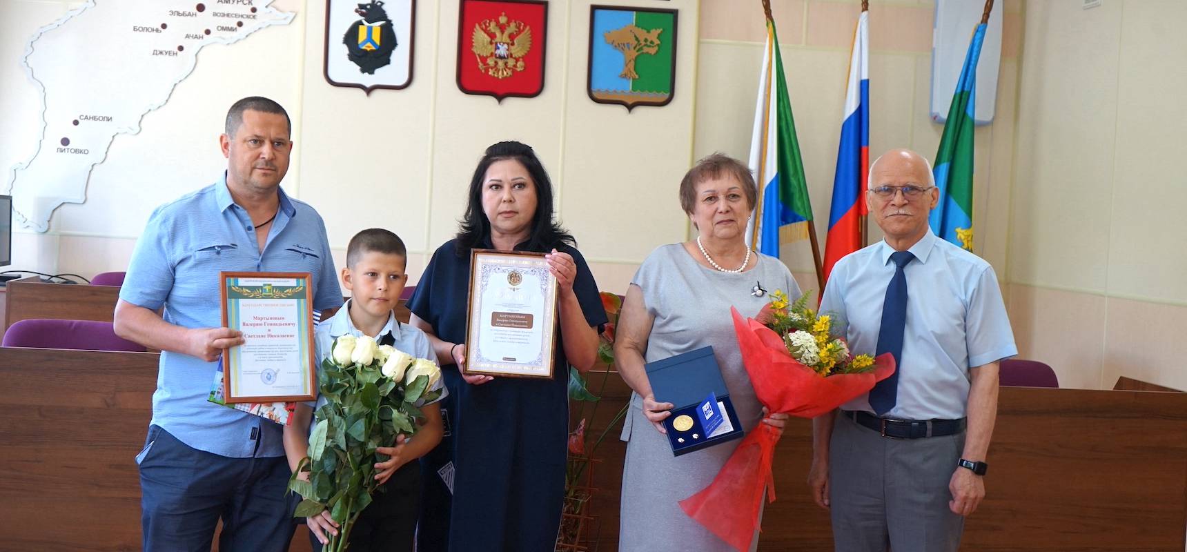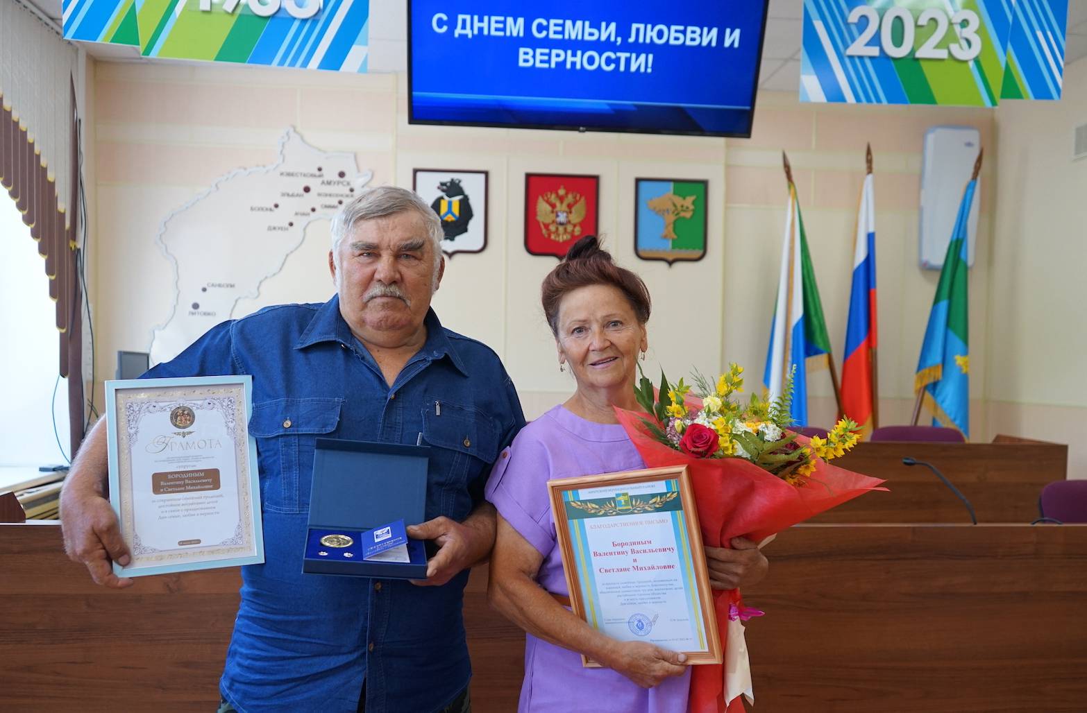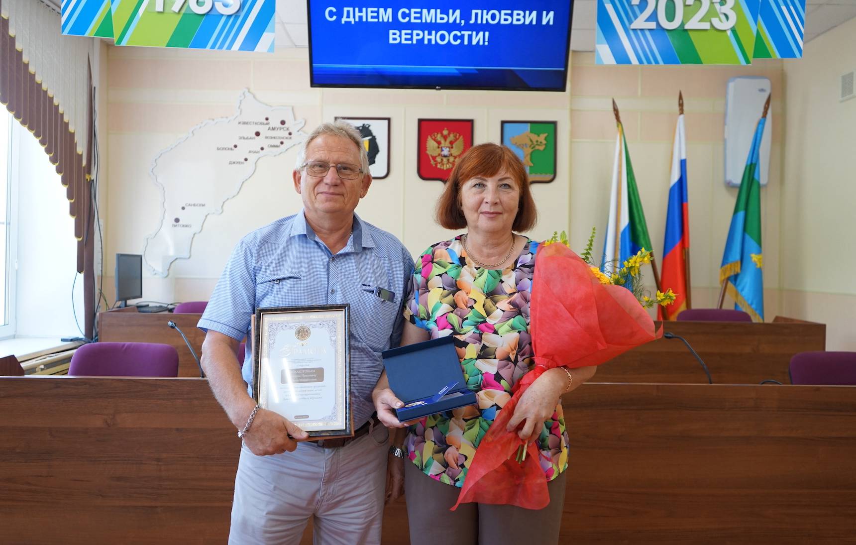 Накануне Дня семьи, любви и верности, который принято отмечать 8 июля, супружеские пары Амурского района стали обладателями медали «За любовь и верность». Ежегодно эта общественная награда вручается лучшим семьям России.