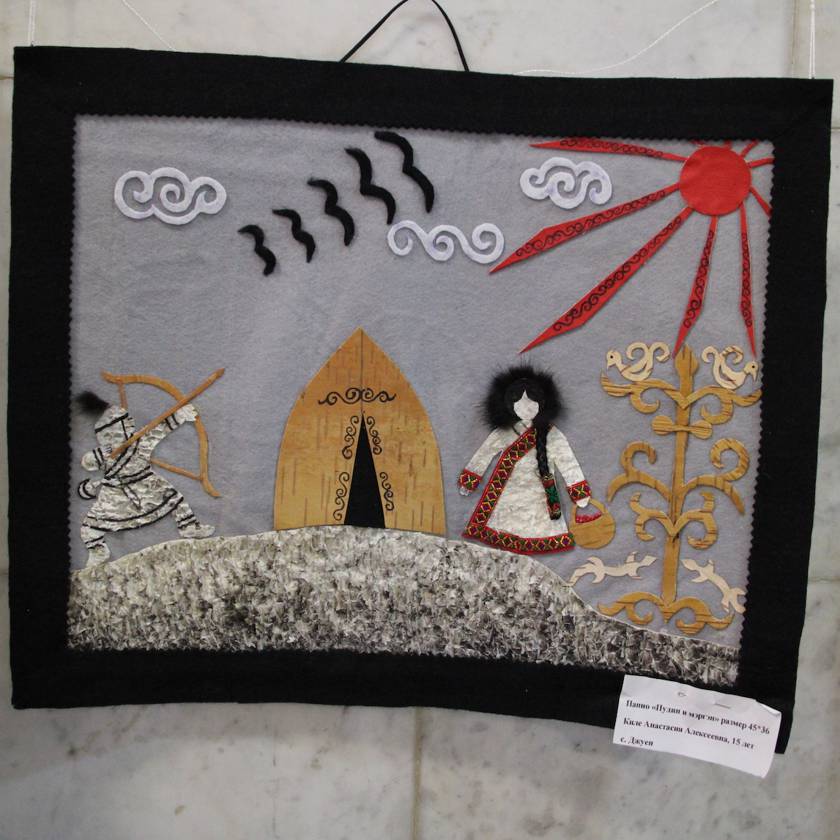 — Это мой первый конкурс, и я рада, что меня отметили, — рассказала Анастасия. — На моей композиции охотник и девушка, собирающая ягоды. Это типичный бытовой сюжет из жизни коренных народов Дальнего Востока. Именно поэтому я выбрала его для своего декоративного панно. В картине использовала бересту, которую мне помогла обработать моя бабушка Людмила Ходжер, а также рыбью кожу и фетр.
