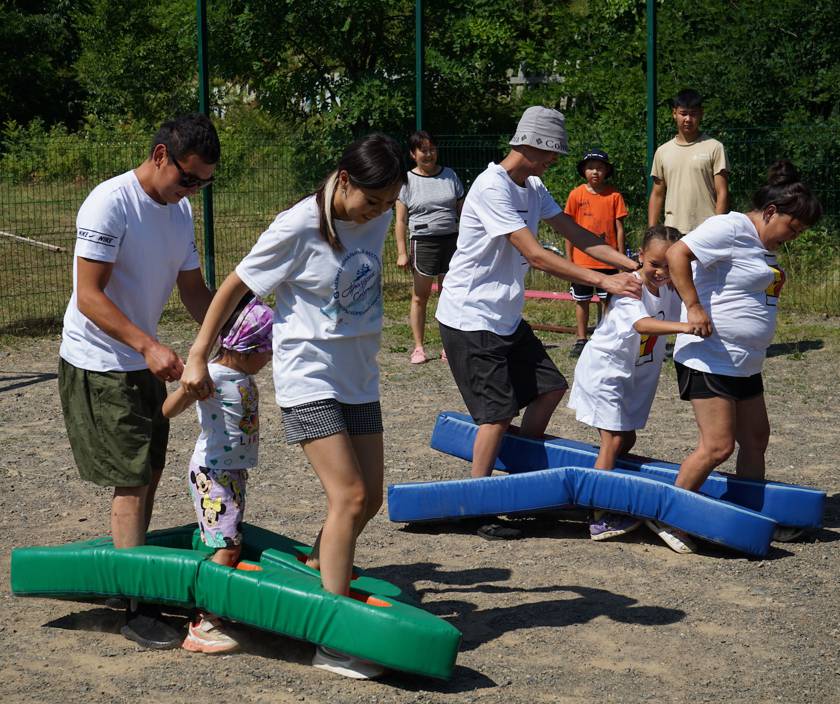 День семьи, любви и верности в Амурском районе не ограничивается поздравлениями и концертами. Настоящее единство проверяется в командных состязаниях, поэтому на прошлой неделе в селе Джуен прошел спортивный фестиваль активного досуга. Мероприятие началось с веселых стартов, в которых приняли участие шесть семей с детьми. Каждый из участников старался принести победу своей команде. От них требовались не только быстрота, но и умение работать сообща. Например, при передвижении на больших надувных лыжах большую роль играла синхронность шага. «Раз, два, левой, правой» — задавали темп для своей семьи впереди идущие мамы. Особенно всех повеселили забеги в больших подгузниках и надувных ботинках, когда родители делили одну пару обуви на двоих. А традиционное перетягивание каната заменили игрой «Тянучка». По итогам всех конкурсов лидерами этой забавной эстафеты стала семья Ван-Киле.
