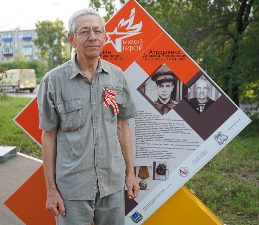 В 2021 году благодаря проекту некоммерческой организации «Центр поддержки социально-культурных инициатив «Арт-проект», при содействии администрации города и сотрудников Дворца культуры возле Обелиска Славы появилась новая достопримечательность — аллея «Близкий герой». Она посвящена памяти и заслугам наших воинов-земляков. На красивых стендах тогда разместились девять историй о героях и участниках Великой Отечественной войны. В преддверии 80-летней годовщины Великой Победы на стойках обновили информацию. Теперь здесь записаны пятнадцать новых имен. На торжественном открытии присутствовали жители Амурска и родственники погибших воинов. Дети, внуки и правнуки со слезами на глазах и в то же время с гордостью фотографировались на фоне своих близких героев. О своем отце Алексее Родионовиче Атрошенко нам рассказал его сын Евгений.