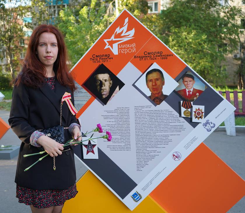 Информация о родственниках амурчанки Анастасии Клименко разместилась сразу на нескольких стендах. В их семье много героев Великой Отечественной войны, но подробно она пока знает только о трех своих прадедушках. Петр Никитич был одиннадцатым ребенком, самым младшим. Несмотря на полученные ранения в первые годы войны, сражался до самой победы. За подвиг награжден орденом Красной Звезды. Седьмого марта 1945 года вместе с другими товарищами он сражался за населенный пункт Кирхов. Сначала открыл огонь одновременно из двух пулеметов и подавил сразу несколько точек противника, тем самым дав возможность стрелковым подразделениям продвинуться вперед. В это время был выведен из строя командир расчета, и прадедушка Анастасии снова лег за пулемет и разгромил вражескую пехоту. Его племянника, Владимира Семеновича Смоляр, призвали на войну позже, в августе 1942 года, после окончания курсов механизаторов сельского хозяйства. Приняли в секретную часть на «Катюши» и отправили на Калининский фронт под Ржев. Но он сражался на многих других направлениях. За годы войны молодой разведчик получил четыре ранения, последнее из них 25 апреля 1945-го. Поэтому День Победы встретил уже в госпитале. После выздоровления вернулся в свою часть и служил в Венгрии.