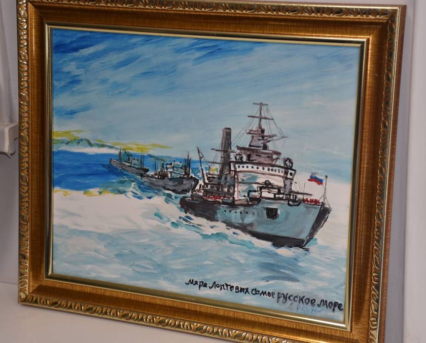 Художник очень любит писать корабли. Именно поэтому Александр Реутов называет себя художником флота. На одной из представленных на выставке картин изображён ледокол «Арктика». Судно было спущено на воду в 2016 году.