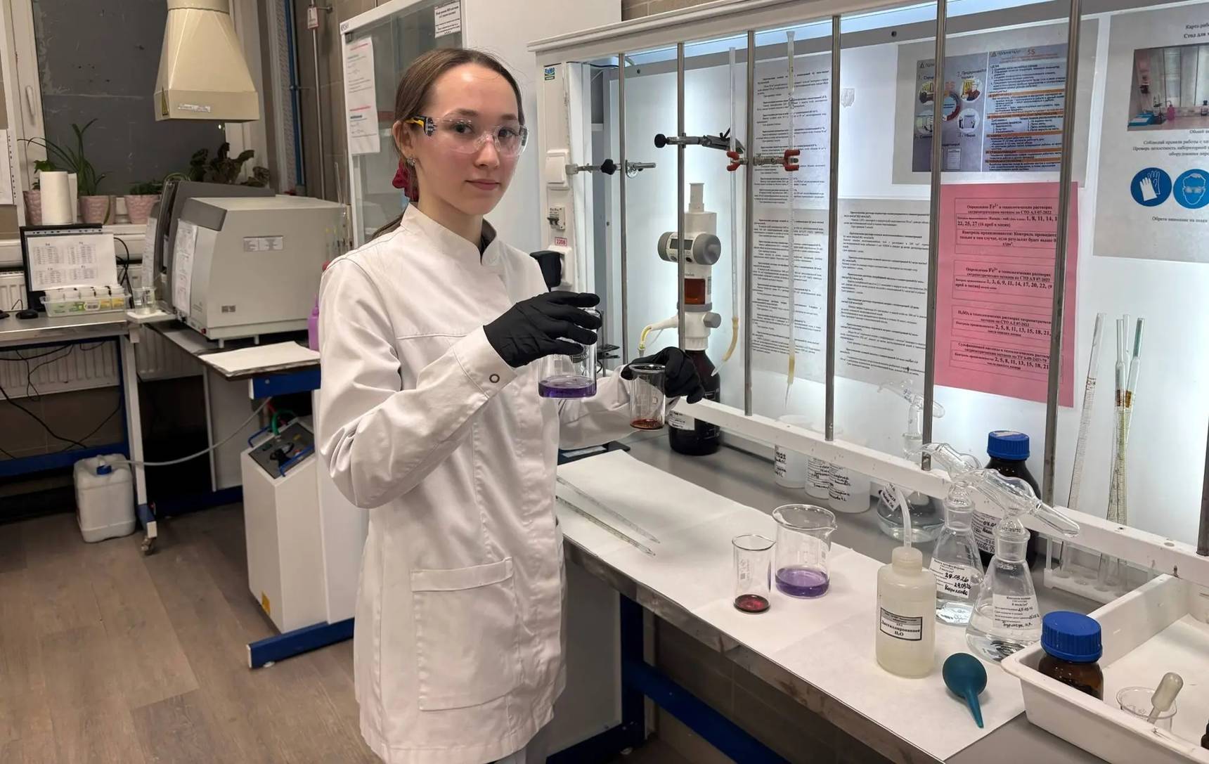«Мы делаем много видов анализов: это и титрование, и приборы – анализатор серы и углерода, атомно-сорбционный спектрометр. Определяем содержание различных реагентов. Операторы смотрят, если нужно, приносят новые пробы. Могут попросить померить РН, удельную электропроводность».