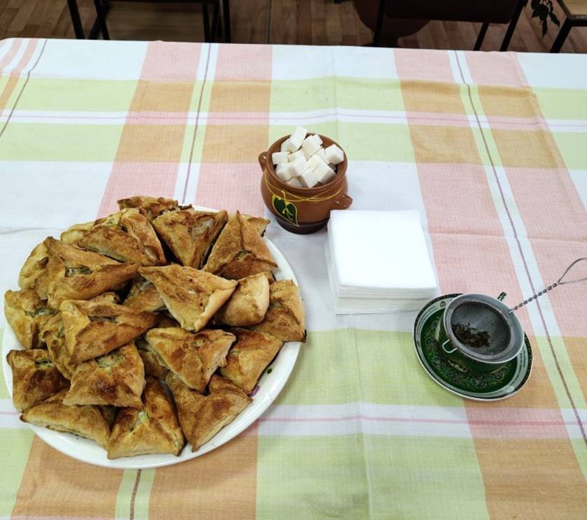 Сотрудники библиотеки приглашали по очереди каждую команду к столу. Угощали чаем с мятой и эчпочмаком и попутно рассказывали, как его правильно есть, и откуда это блюдо родом.