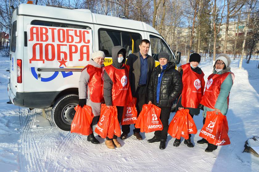 Волонтеры центра «ДаДобро» доставили в Амурск и Эльбан почти полтонны гуманитарной помощи. В рамках акции «Автобус добра» наборы с продуктами, медикаментами и хозяйственными средствами получили 54 пенсионера, а также 23 семьи, оказавшиеся в сложной жизненной ситуации.