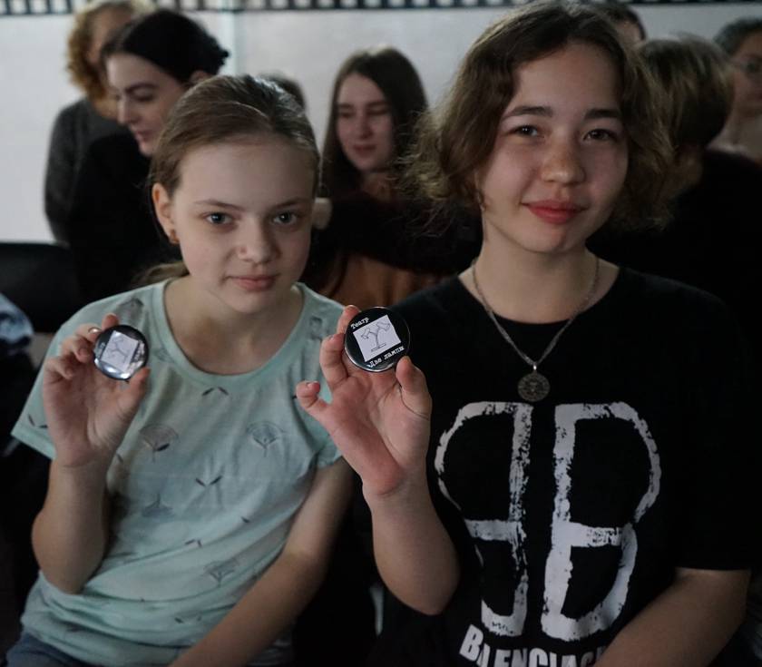 На память о своем первом выступлении в Амурске хабаровские актеры подарили зрителям значки с символичным изображением двух ламп.