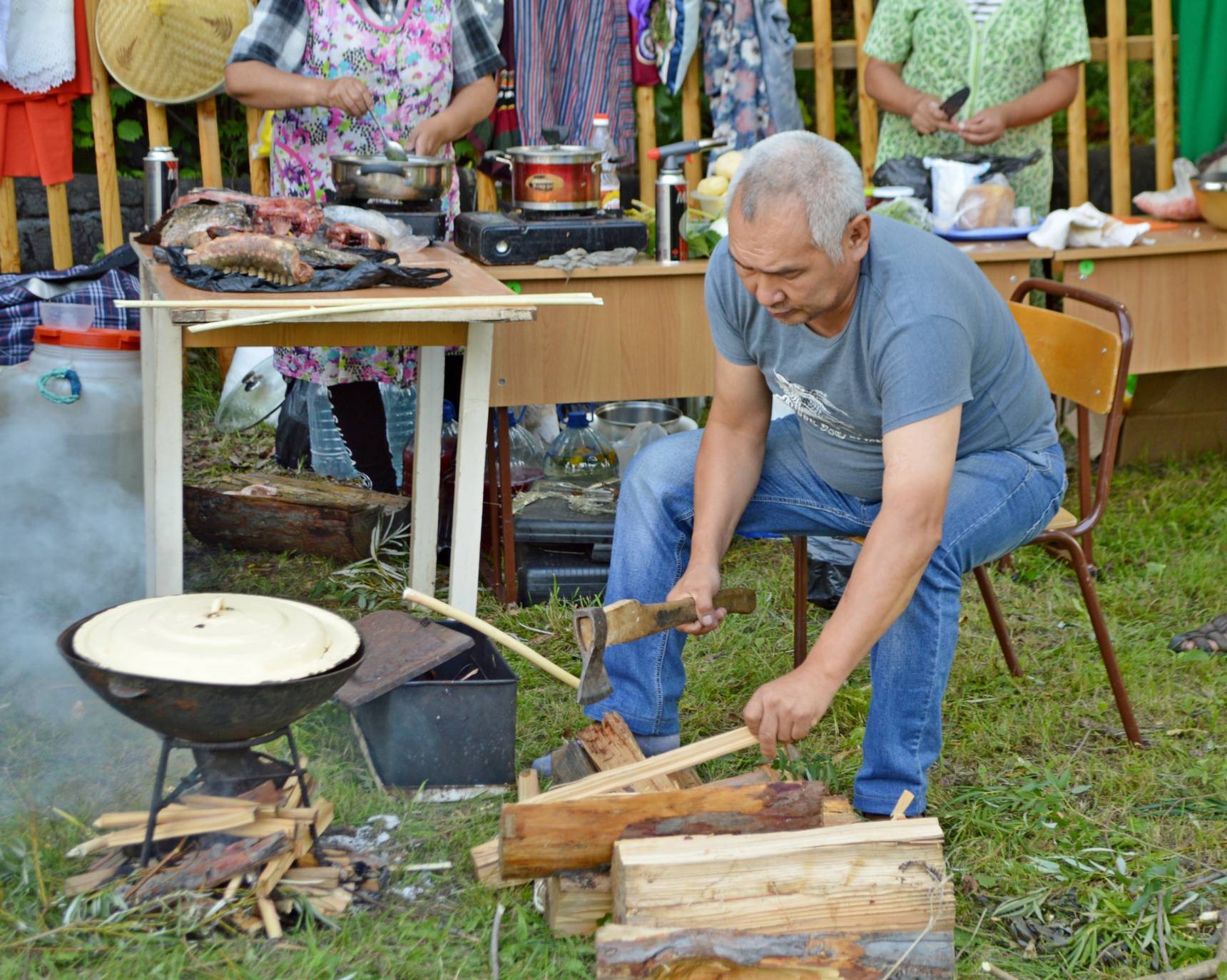 Атмосфера на мероприятии царила праздничная и радостная. Омминцы угощали гостей фирменной ухой. Она получилось такой наваристой и душистой, что собрала вокруг котла множество любителей нанайской кухни. Вскоре очередь выстроилась уже за добавкой. По словам шеф-повара Андрея, в этот день на полевой кухне приготовили около 200 порций или 40 литров ухи из разных видов рыбы.