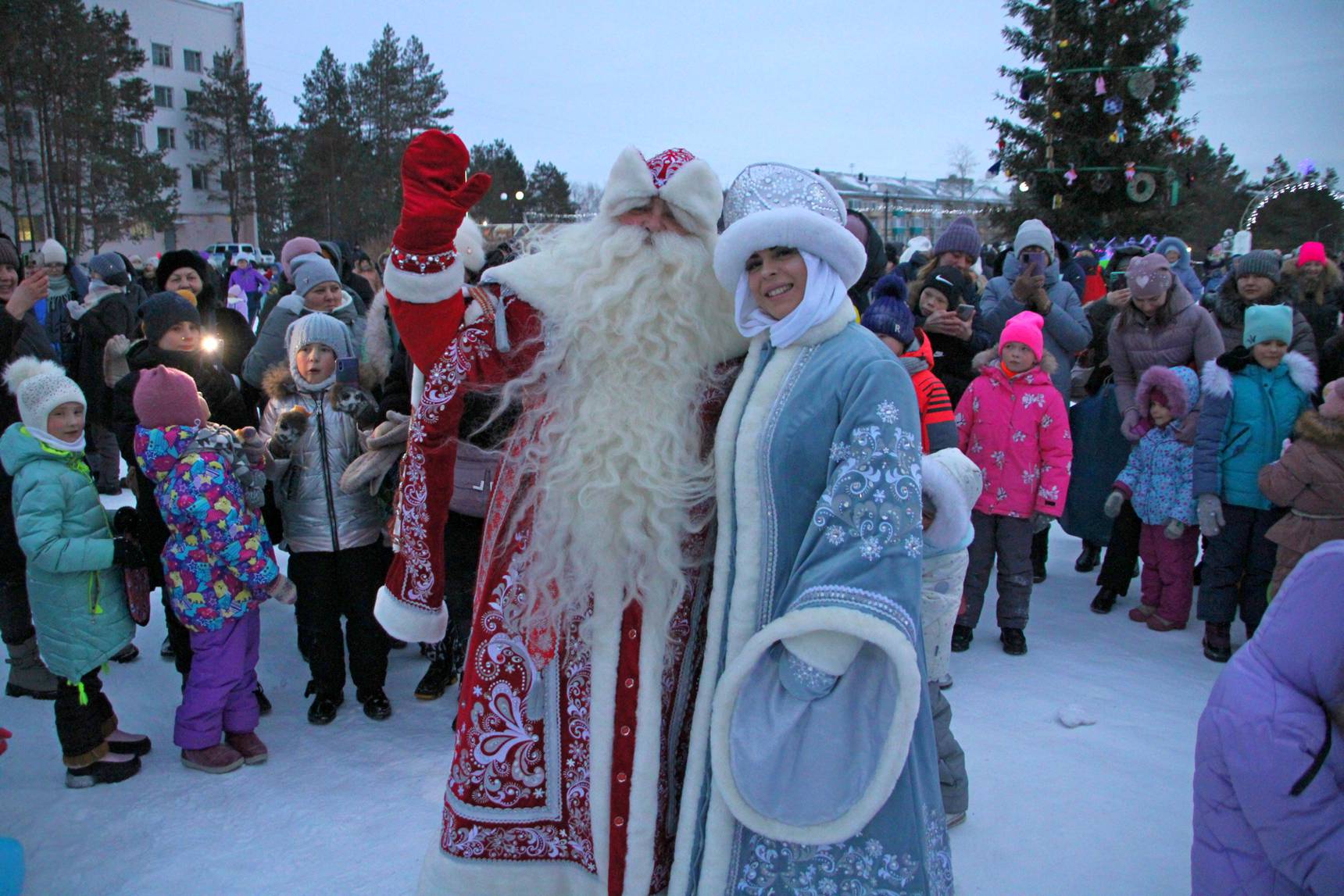 На площади собрались сотни горожан, которые ждали появления главных новогодних волшебников. Те не заставили себя ждать и прибыли на праздник вовремя. Прежде чем добраться до места празднования, Дед Мороз и Снегурочка прошли по площади, пожали руки юным амурчанам и сделали с ними фото на память.