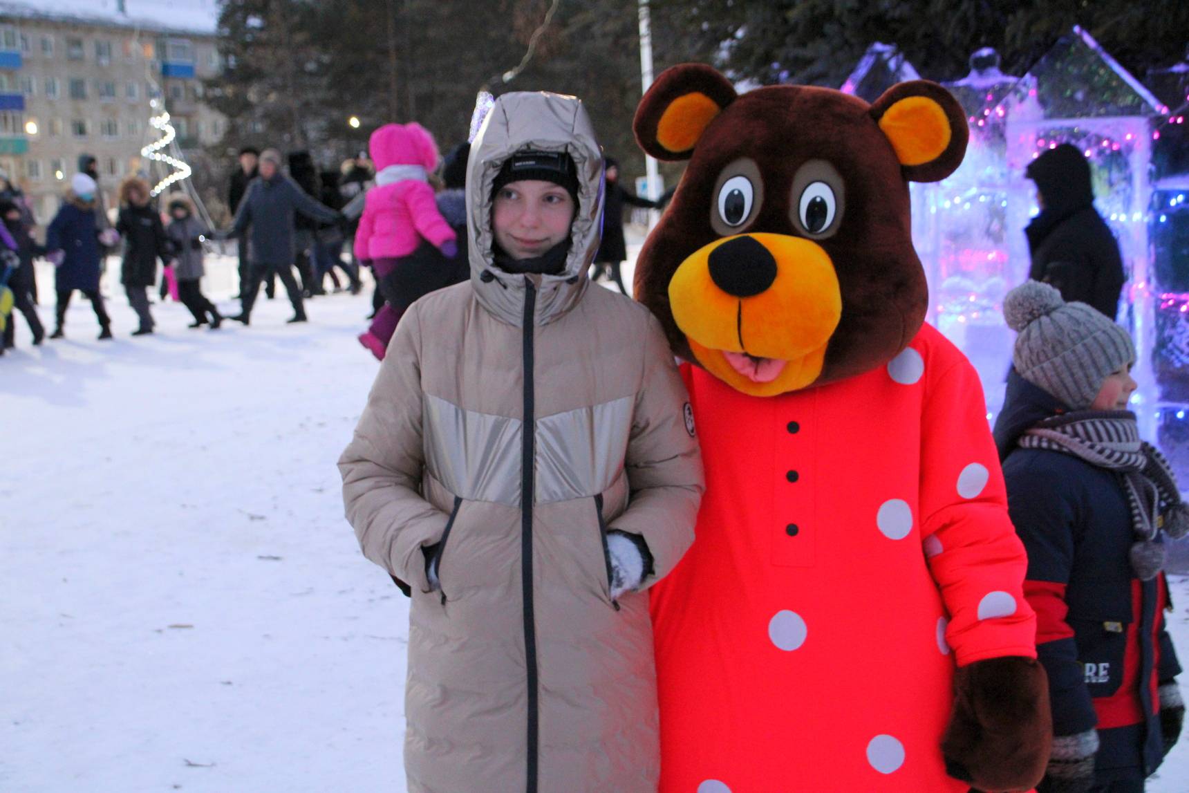 После завершения церемонии открытия амурчане продолжили гулять на площади, фотографируясь с ледовыми фигурами и ростовыми куклами. Городок, к слову, пришелся им по душе.