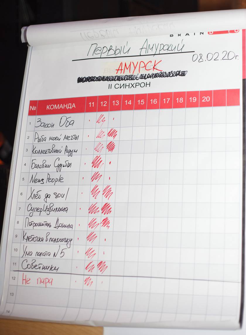 Первый синхрон Амурского турнира прошел легко: команды правильно отвечали на вопросы и шли вровень. Только в самом конце случился «гроб» — вопрос, который не смог взять никто. По итогам раунда определились 5 лидеров: команды «Закон Оба», Newspeople, «Коллективный разум», «Потрошители Данила» и «СуперИзвилина».