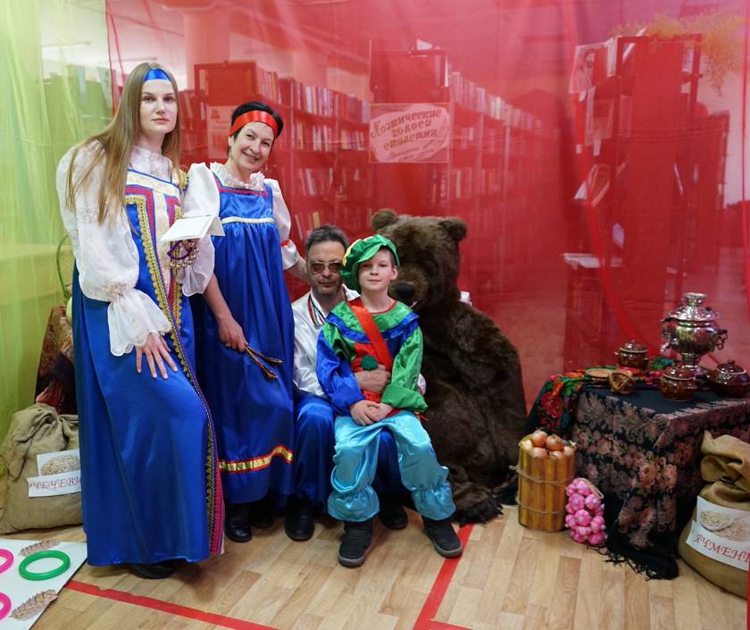 — Аристократичное общество в большинстве своем было европеизированным, светские мероприятия проводились в основном для людей статусом не ниже дворянского. Поэтому простой крестьянский люд развлекался так, как это было во все времена: с играми, частушками, угощениями. В основном гуляния проходили на торговых площадях и ярмарках. Несмотря на то, что Петр I привез из Европы много нового, он уважал русские традиции и обычаи, даже не гнушался есть с простого стола, — отмечает Инна Лукашова, библиотекарь. — Русские традиции прослеживаются не только в праздничных гуляниях, но и в формах народного творчества. Изделия русских промыслов сочетают в себе неповторимость русской традиционной культуры. Мы постарались передать эту атмосферу. На столе у нас стоит посуда из дерева ручной работы, разные изделия, расписанные хохломой, самовар, соленья, даже искусственную шкуру медведя нашли.