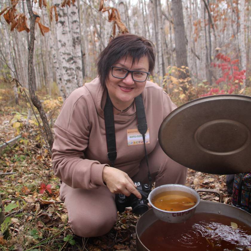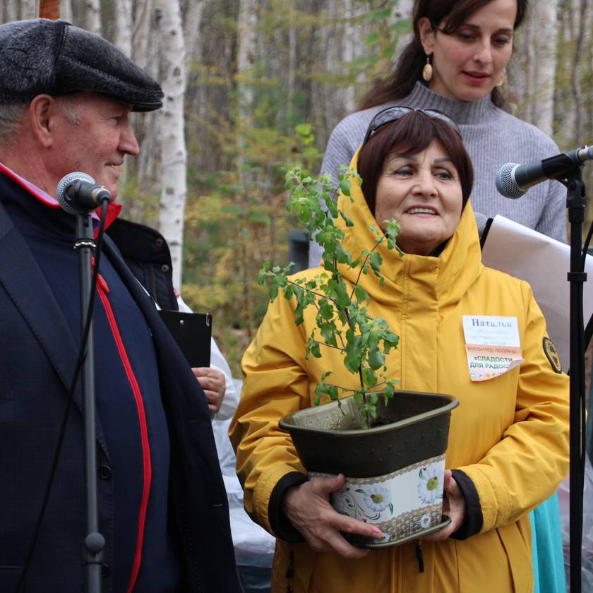 Геннадий Кузьминых пообещал растить и лелеять подарок. После этого началась программа с посещением полян. Между ними участников угощали приготовленным на костре чаем с яблоками.
