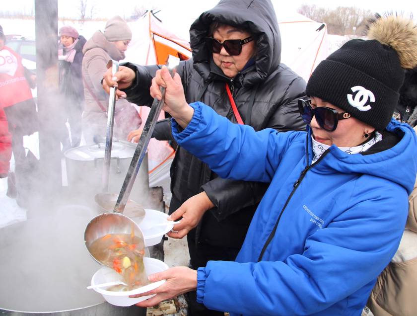 В течение праздника жители села Омми готовили на костре 30 литров шурпы из мяса сохатого для угощения участников и гостей праздника. После все желающие могли отведать угощения и согреться чаем с шиповником.